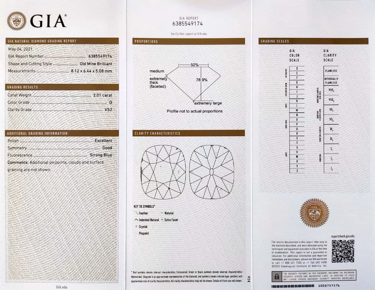 Amazing 2.01 Ct. D VS2 Old Mine Cushion (Strong Fluorescence), with a beautiful High crown and a marvelous cut. Very large culet adds the antique personality much loved in old cut diamonds. a gorgeous stone to mount in a ring or pendant.