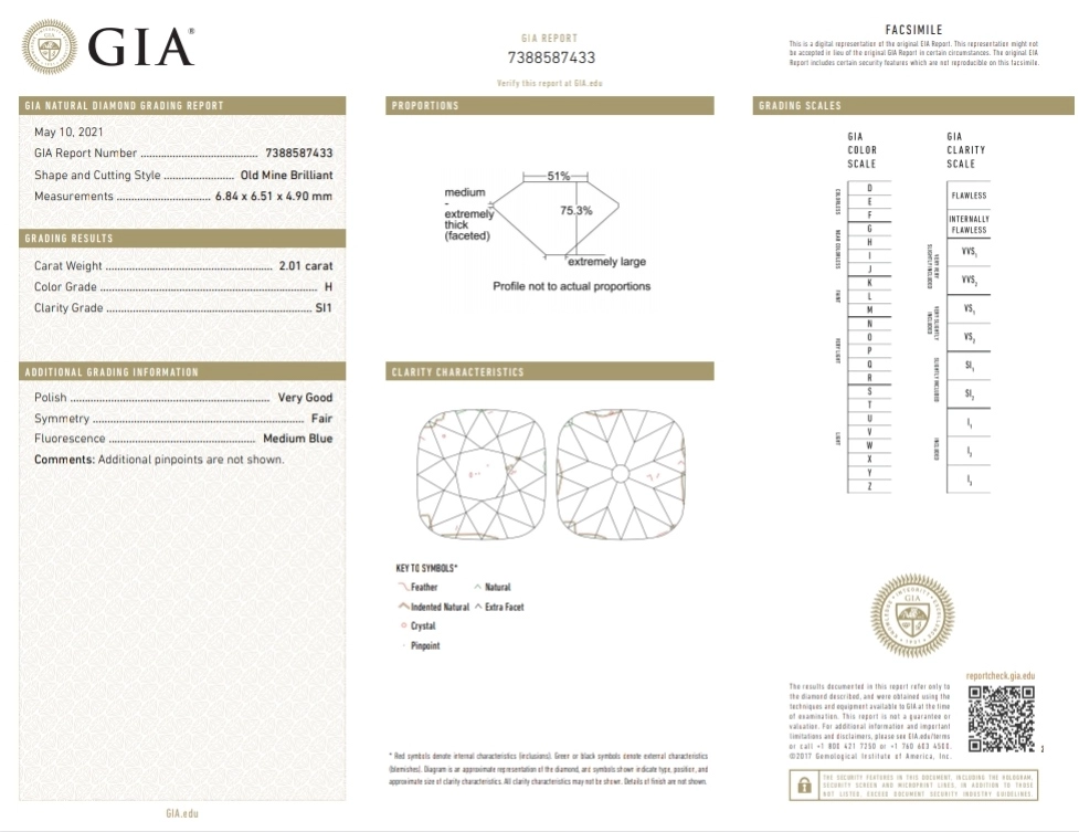 Amazing 2.01 Ct. H SI1 Old Mine Cushion (Medium Fluorescence), with a beautiful High crown and a marvelous cut. Very large culet adds the antique personality much loved in old cut diamonds. a gorgeous stone to mount in a ring or pendant.