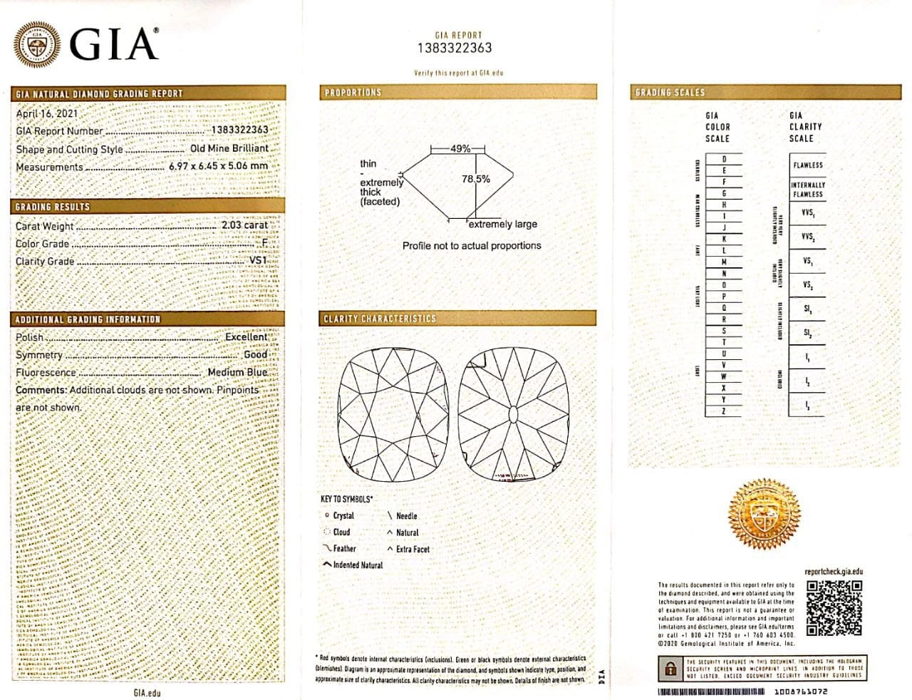 Amazing 2.03 Ct. F VS1 Old Mine Cushion (Medium Fluorescence), with a beautiful High crown and a marvelous cut. Very large culet adds the antique personality much loved in old cut diamonds. a gorgeous stone to mount in a ring or pendant.