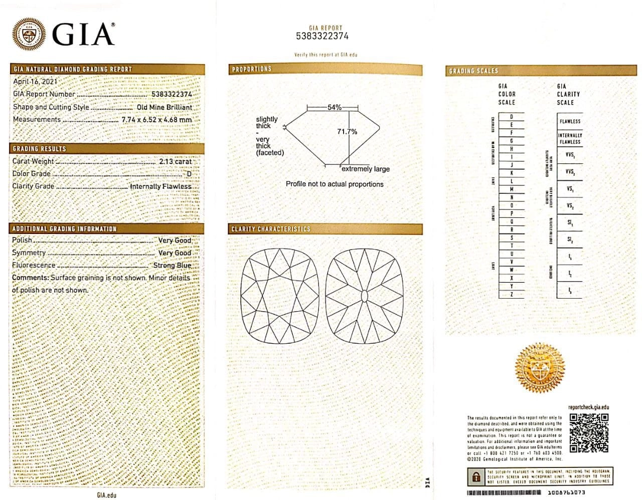 Amazing 2.13 Ct. D IF Old Mine Cushion (Strong Fluorescence), with a beautiful High crown and a marvelous cut. Very large culet adds the antique personality much loved in old cut diamonds. a gorgeous stone to mount in a ring or pendant.